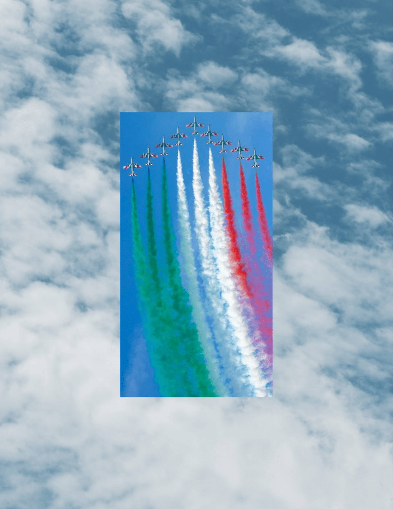 “Frecce tricolori” are still symbol of national pride, all over the world; the sky of the picture, in which they move is full of clouds… not clear like the italian state, and “it’s often hail, that reaches us”.🌨️
